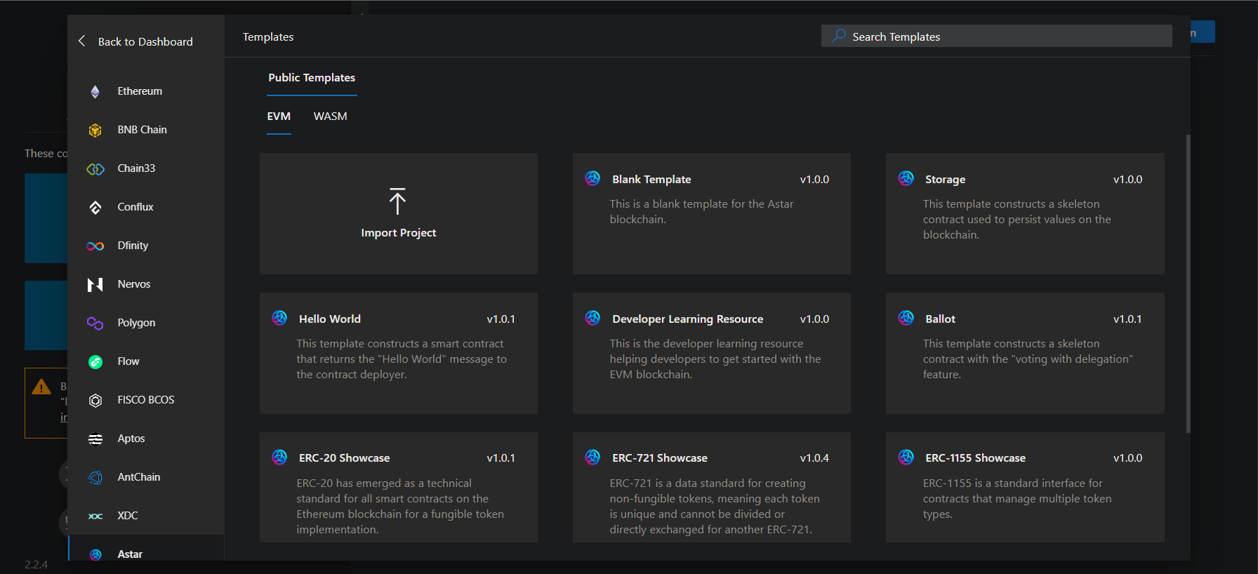 Astar EVM IDE provides developers with various basic or complex templates, such as Hello World, ERC-20, ERC-721, Hardhat dApp Wave, and more. Click to enter a template.