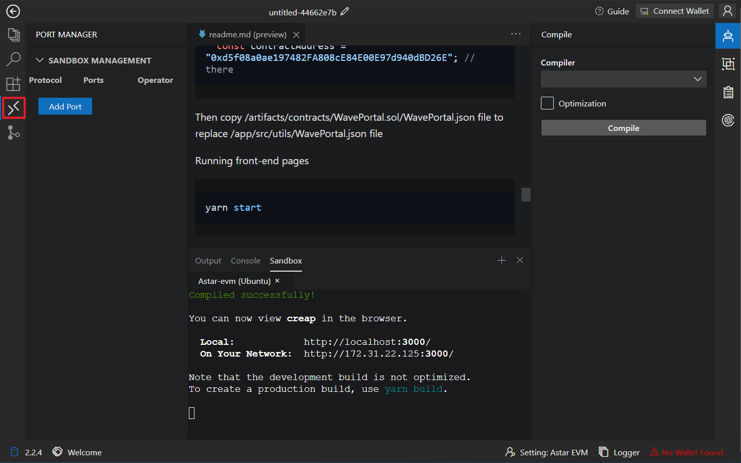 ChainIDE Sandbox makes it easier to develop full-stack dApps by providing powerful features such as port-forwarding. This means you can build a frontend for your Astar dApps using frontend frameworks (React/Vue/VanillaJS) in the browser. To build the frontend for Astar dApps, please use Voting dApp or Hardhat dApp Wave template. Follow the steps below showcasing how the port manager can be used to access the frontend.