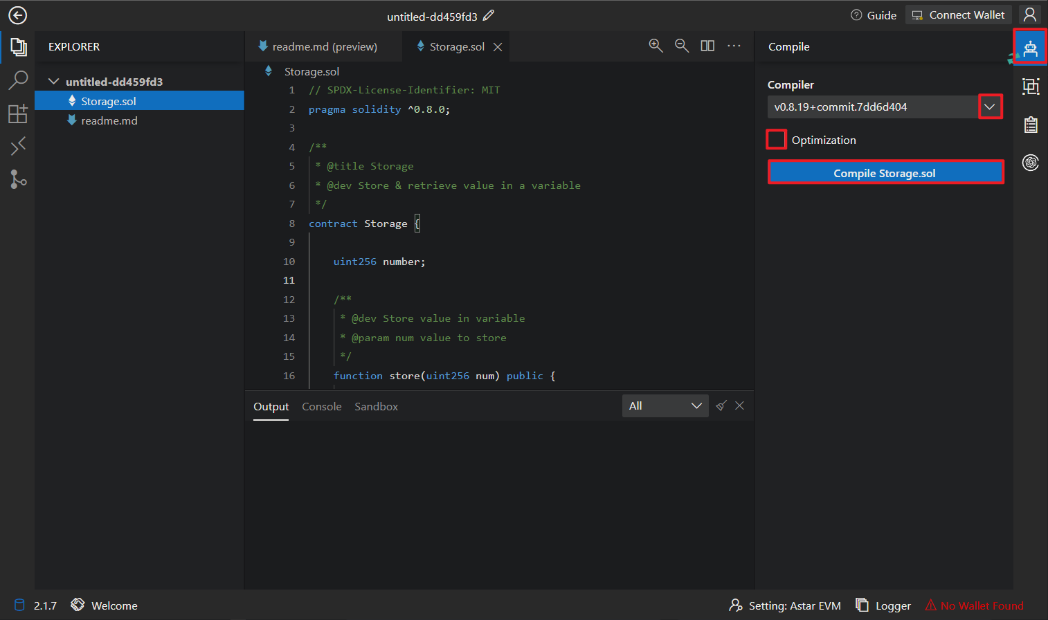 Before deploying the contract, you need to click on "Connect Wallet" in the upper right corner and select to connect to JavaScript VM (used for testing, implemented in JavaScript) or Metamask (for deployment on the Astar blockchain).