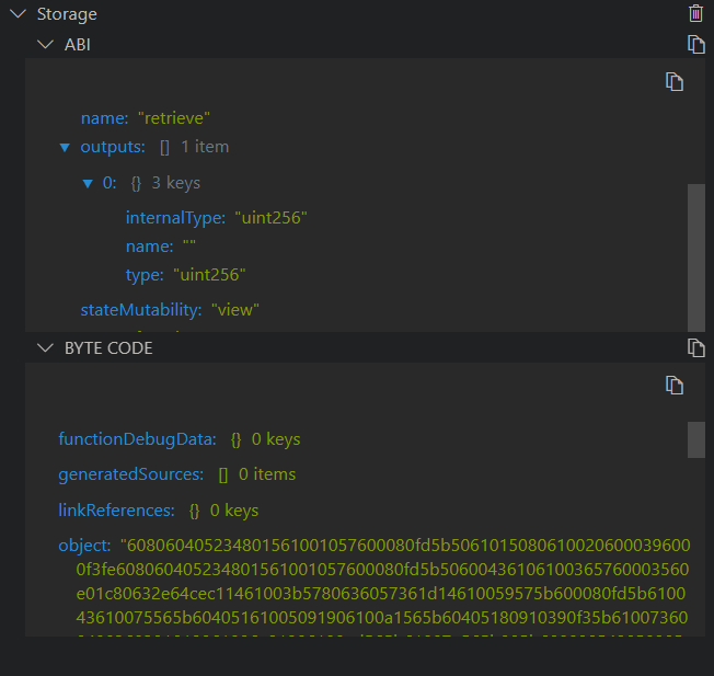After successful compilation, the ABI and BYTE CODE will be displayed below, and you'll see a message in the console stating "Compile contract success."