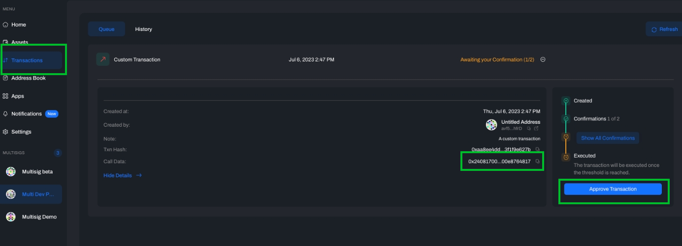 1. Choose one of the signatories (owners) to create multisig transactions;