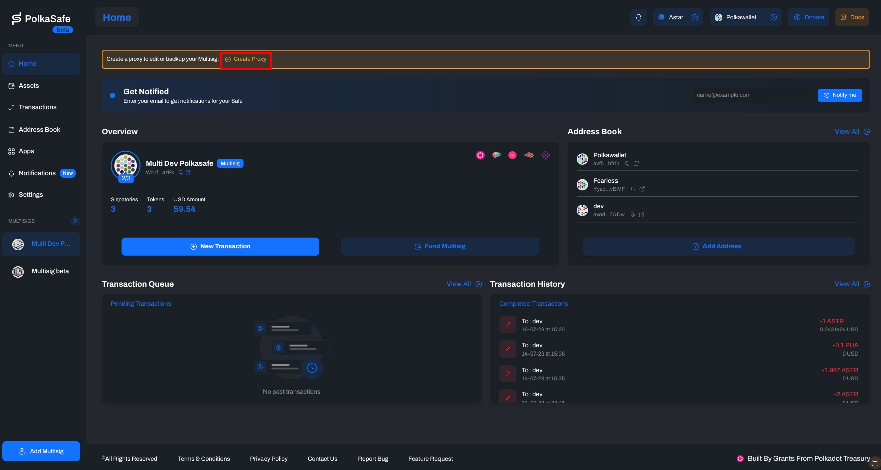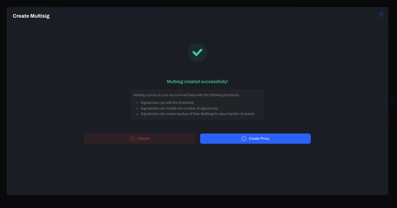 3. Create Backups: Establish a backup of the multisig account, facilitating seamless asset transfers. In other words, all assets will be in the proxy account. This means that when you add or remove any signatory, the multisig address will change, but the proxy address will not. Therefore, assets in the proxy account won't be lost.