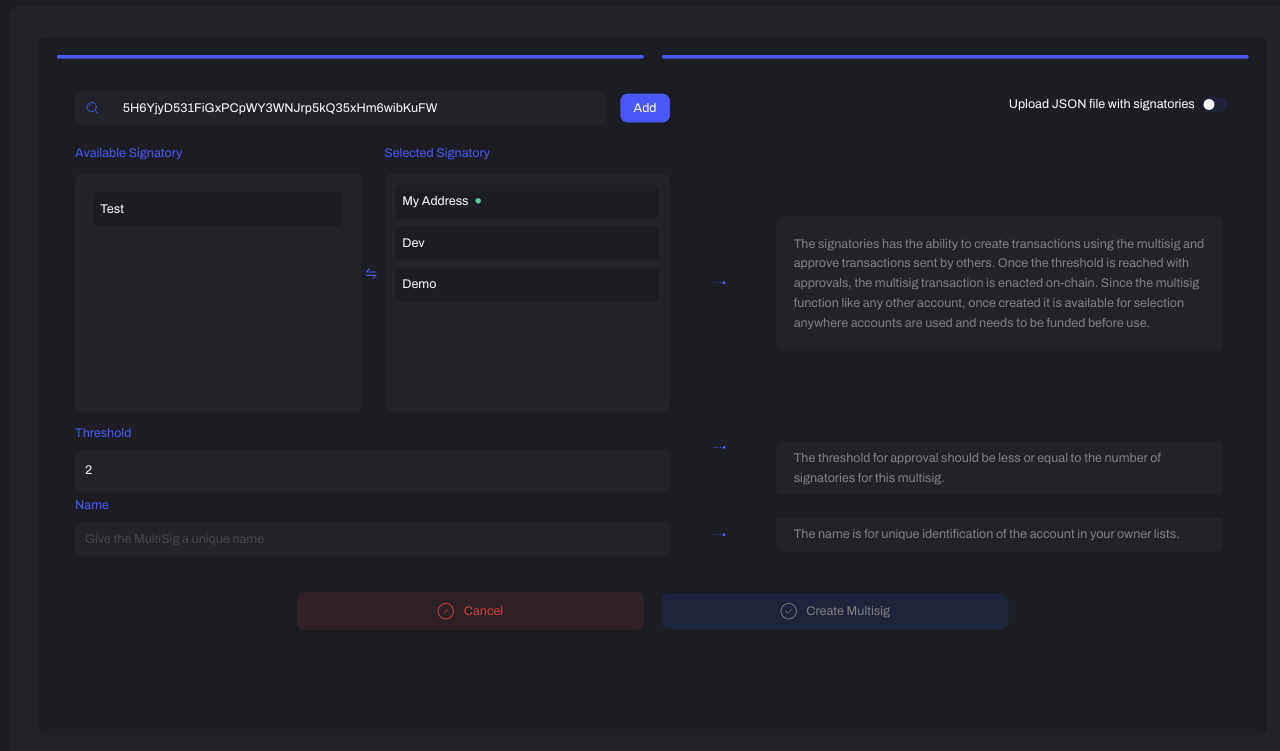 1. Choose the signatory addresses to include in the multisig account. You can select from your wallet or add an address manually;