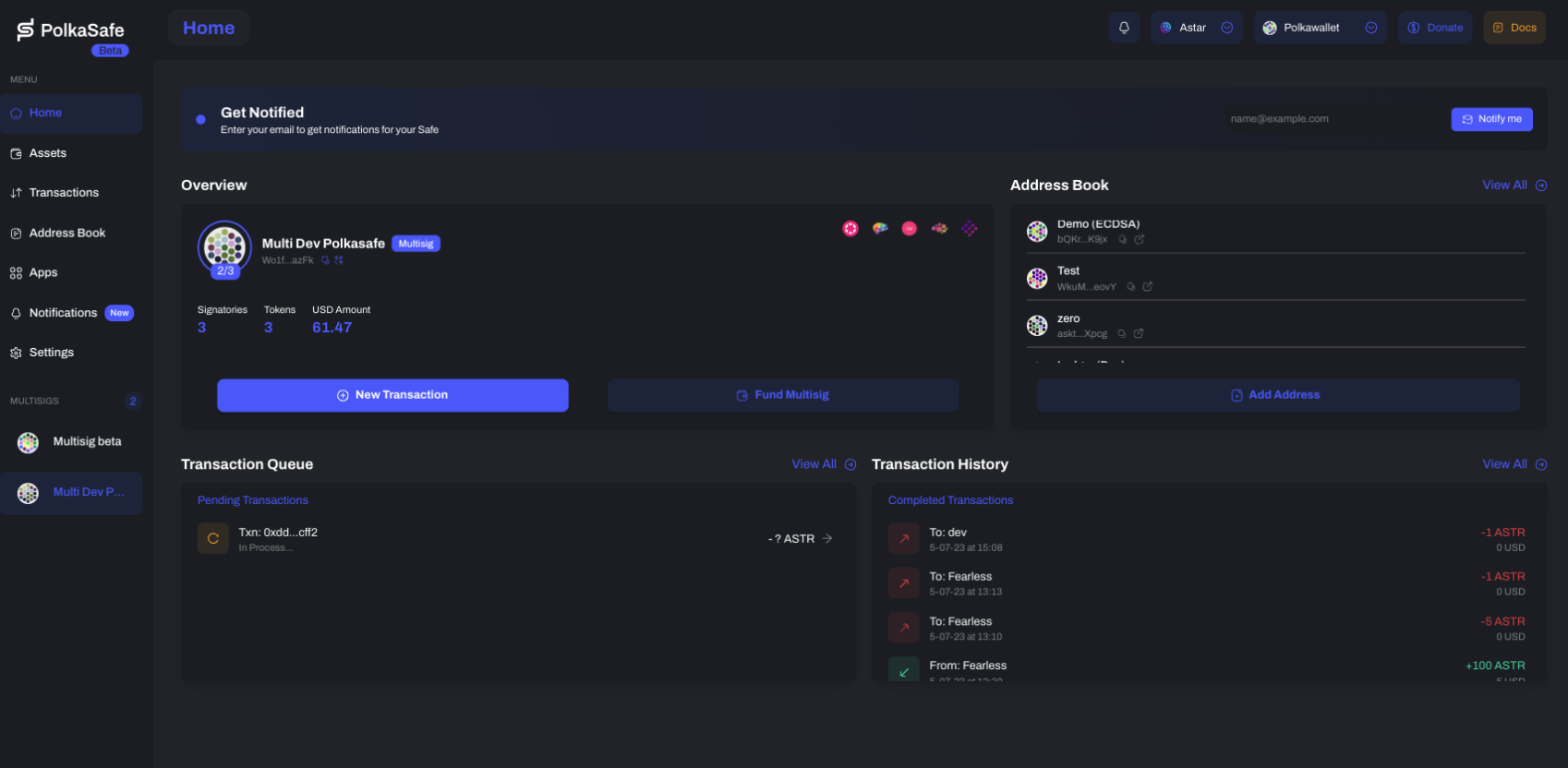 PolkaSafe integrates with Polkadot's multisig solution, offering seamless user experience and robust security features for managing assets in the Polkadot ecosystem. You can use the multisig accounts created on PolkaSafe with the Astar Portal.