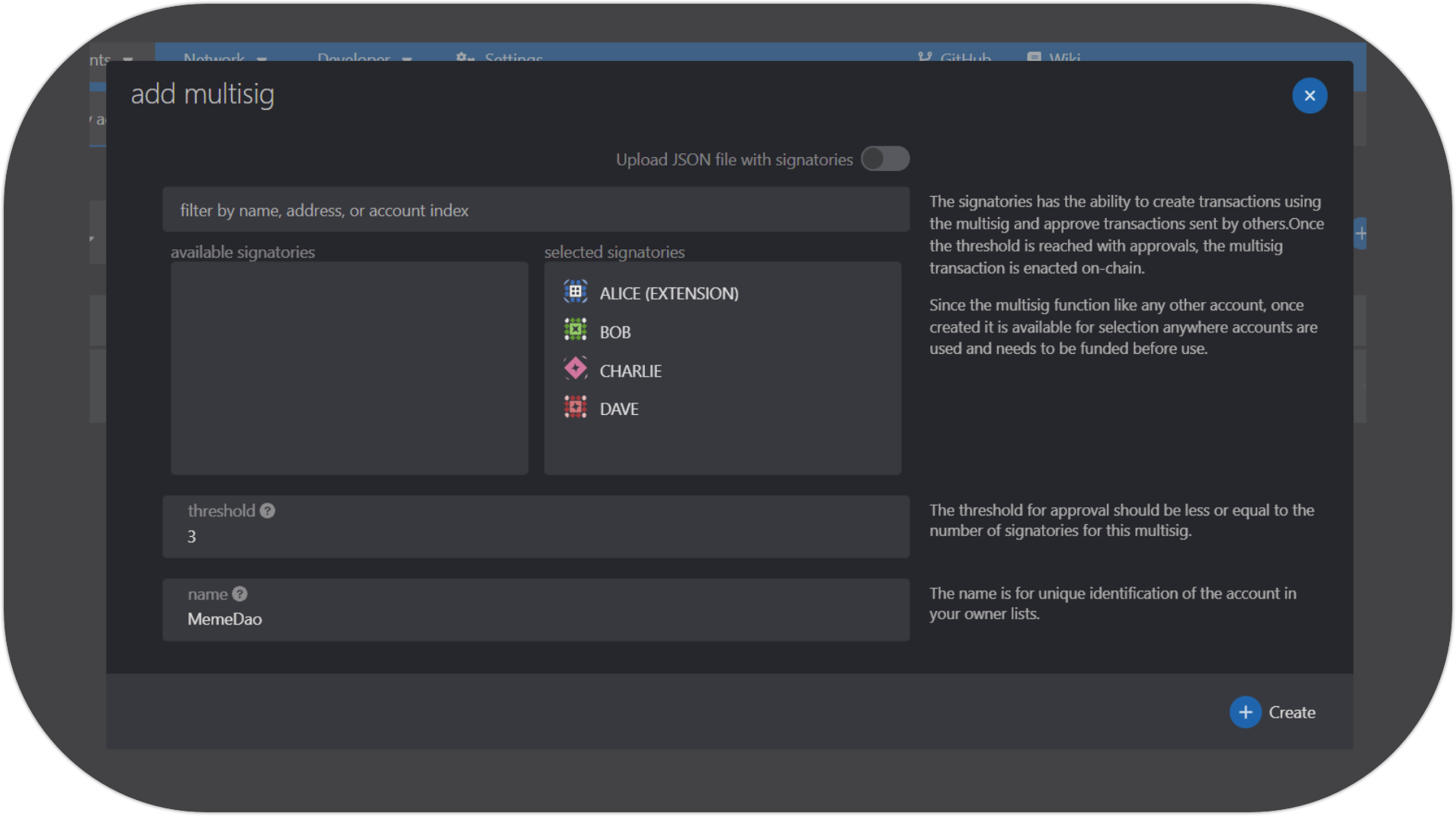 + Multisig; - From the available signatories, select the ones that you want to include in the multisig;