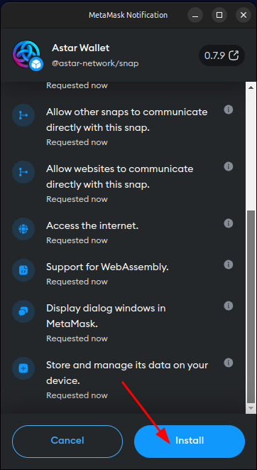 Click the arrow to view the entire list of permissions required by the Astar Wallet snap and, if you accept them, click the MetaMask "Install snap" button labeled "Install" to begin installing the Astar Wallet snap.