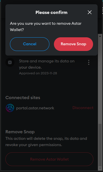 In MetaMask, click on the tripple dot icon on the top right of the extention, then Snap, lastly click on Astar Wallet, scroll to the bottom and click Remove Astar Wallet